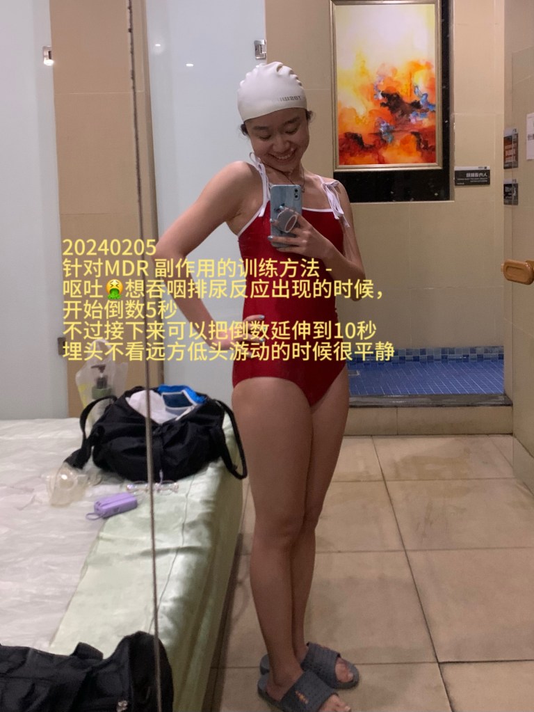 MDR副作用- 想排尿/想吞咽/站起来晕眩💫/打嗝 。我发现- 低头慢慢游动,什么也不想,会感受到平静。所以接下来的训练方法是低头往前游,当MDR副作用出现的时候,开始倒数十秒就抬头起来。仰面人鱼游感受到了腰部带动腿甩起来的顺畅感—— 腰腹部都要用力。会在游动中往左斜,初步猜测是右腿发力过大,后续游动时会有意识加大左腿力度。今日游泳结束,大腿根和上肢感受到了疲惫😪。